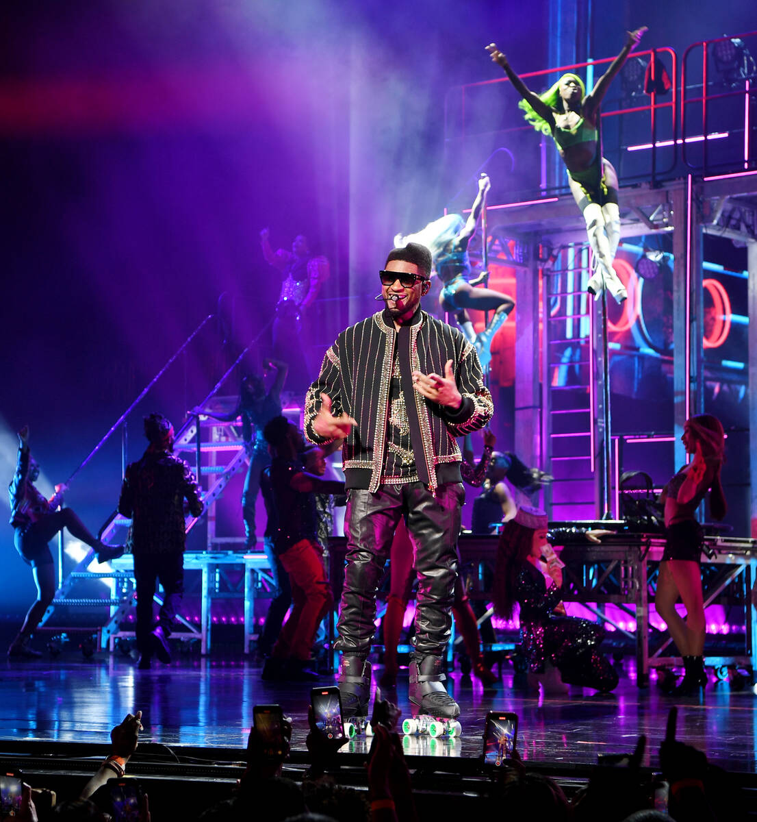 On Thursday, Usher arrived in characteristically stylish fashion. He wore baggy black pants and a white jacket gleaming with what appeared to be Swarovski crystals (or especially fancy rhinestones) with a red heart and letter “A” across the left front. The superstar had told his audience at the Colosseum on Wednesday he’d tweaked his left knee (former Fox 5 anchor Christine Maddela tweeted that information from the theater), but showed no evidence of being restricted.