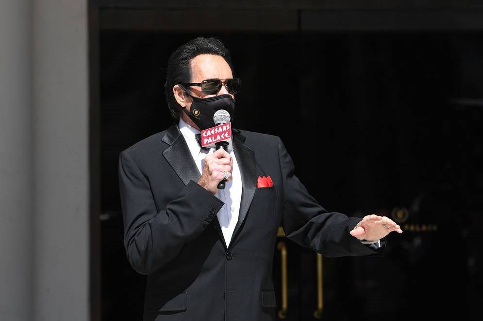 Wayne Newton reassumed his civic ambassadorship Thursday, donning a tux and a matching face mask to lead the COVID-19 reopening of Caesars Palace. Newton said that he was eager to slip back into the tux “to make sure it still fit” after a nearly three-month break from the stage.