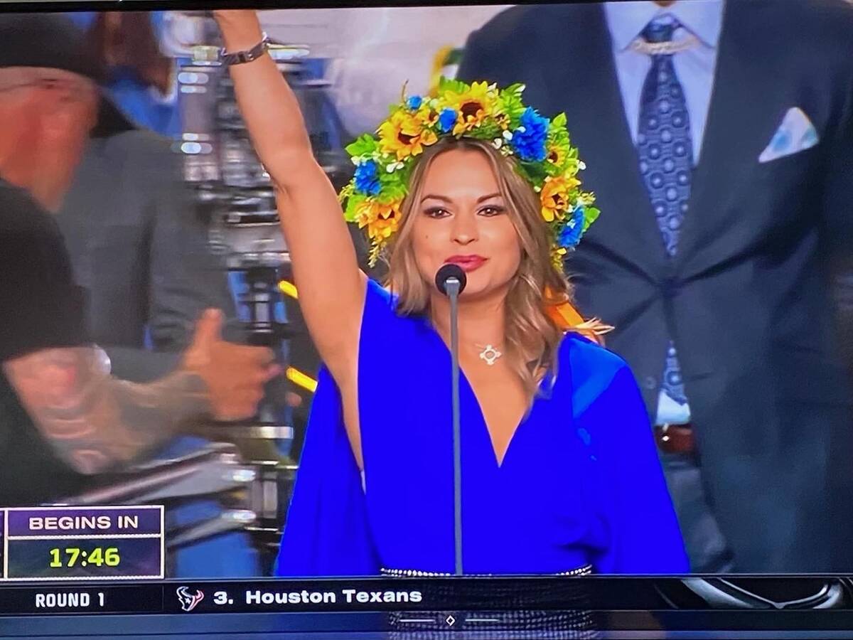 Ukrainian-born Jenny Arata of The Skating Aratas of “V — The Ultimate Variety Show” addressed the NFL Draft Theater crowd before the start of the first round.