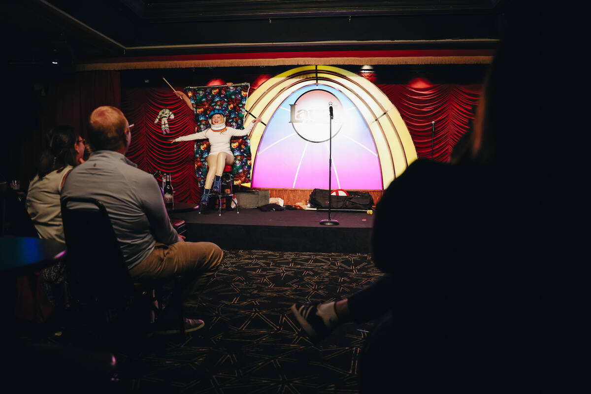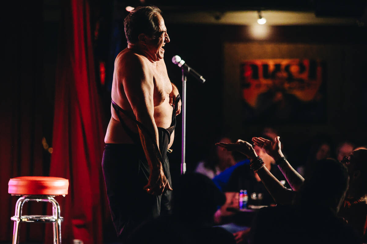 That Basil is among the last comic standing in this space is only appropriate, for his history in keeping it alive and relevant. Basil came back with “The Movie Guy” routine at Sunday night’s two closing shows. The 64-year-old performer was like a big kid, flying as Superman with an audience member stretched across a stool, and reviving his devastating Schwarzenegger impression in a full-muscle suit.