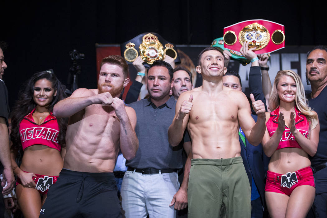 All the fighters on Saturday’s card stripped and stepped during the hourlong event. Predictably, fan fave Saul “Canelo” Alvarez drew explosive cheers from the largely Latino crowd. Eschewing pomp, Canelo took the stage sort of casually, just as ring announcer Michael Buffer was dramatically listing the career achievements of Gennady “GGG” Golovkin. (GGG should have his own slot machine, with the three Gs lining up for a jackpot. Someone get on that.)