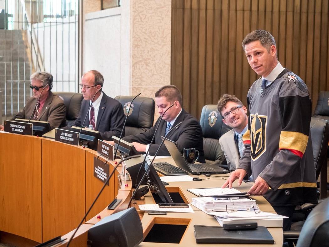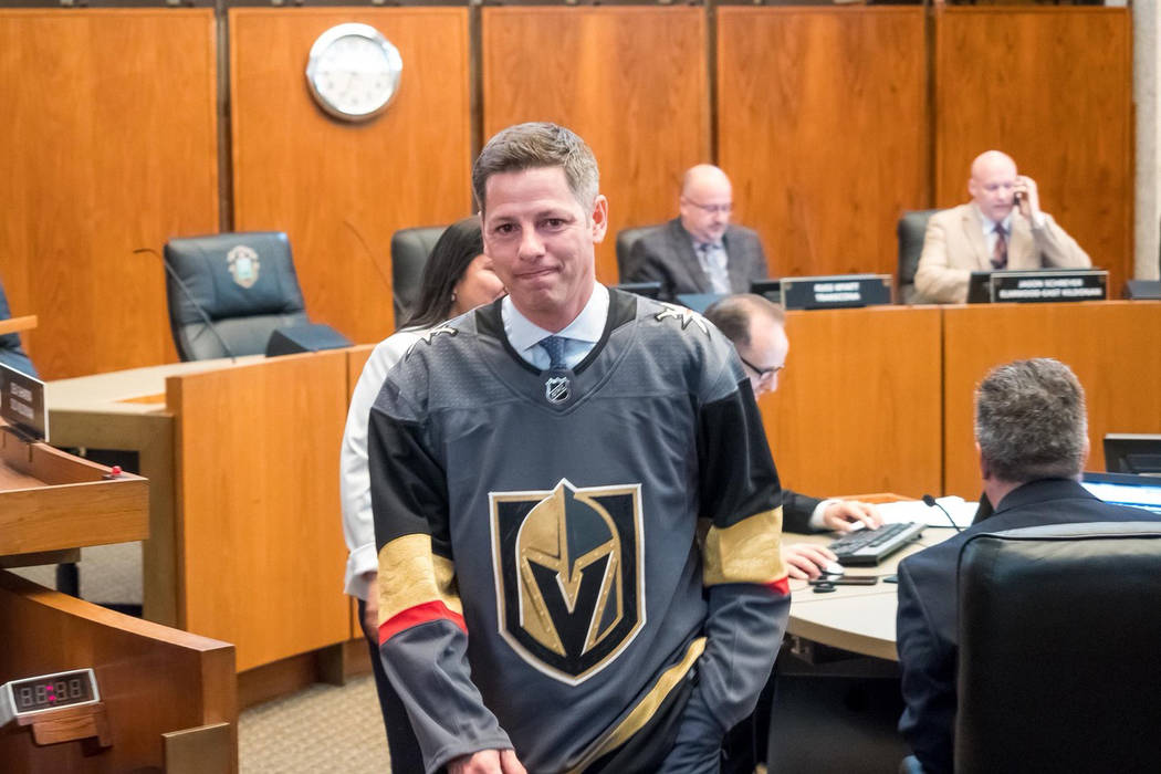 Working through intermediaries, Bowman and Goodman had agreed that the loser of the VGK-Jets series was to wear the winning team’s sweater to a City Council meeting or public event of equal relevance, and also post the photos to social media.
