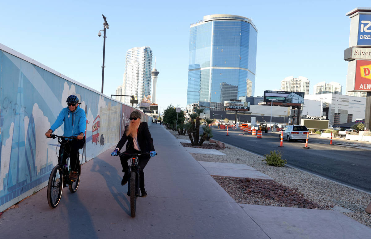 Gibbons has been eager to get out and play two-wheel tourist, so our pedaling trio hit the Las Vegas Strip on Tuesday afternoon and into the evening. I was the third wheel. Gibbons didn’t mind. He’s thrives in a three-person lineup.