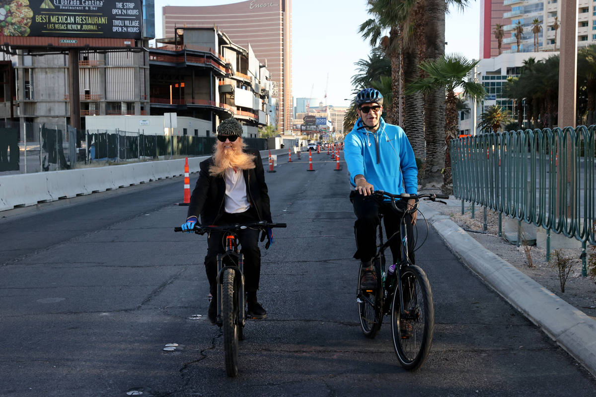 We meet at the base of The Strat, with Gibbons and Gilligan biking all the way over from the couple’s home in Rancho Circle. Gibbons beamed behind his famous beard at the opportunity to see the Strip from a bike as opposed to a car. Say, a ’33 Ford Coupe.
