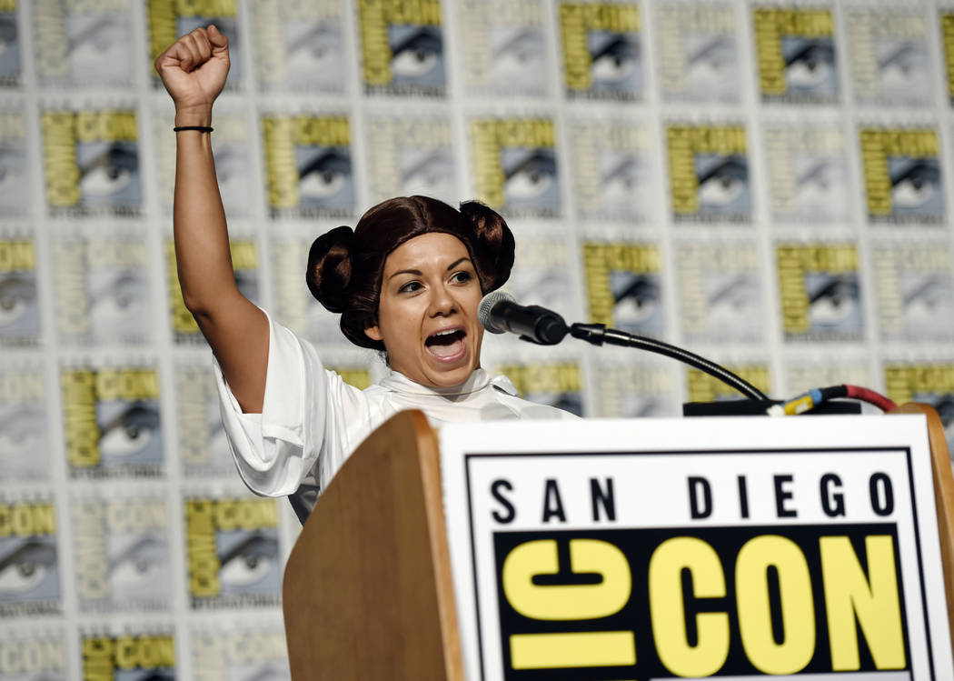 Guest speaker Diana Font of Orange, Calif. addresses the audience during the Princess Leia Star Wars Fan Club Tribute Presentation during the 2017 Comic-Con International on Sunday, July 23, 2017, in San Diego, Calif. (Photo by Chris Pizzello/Invision/AP)