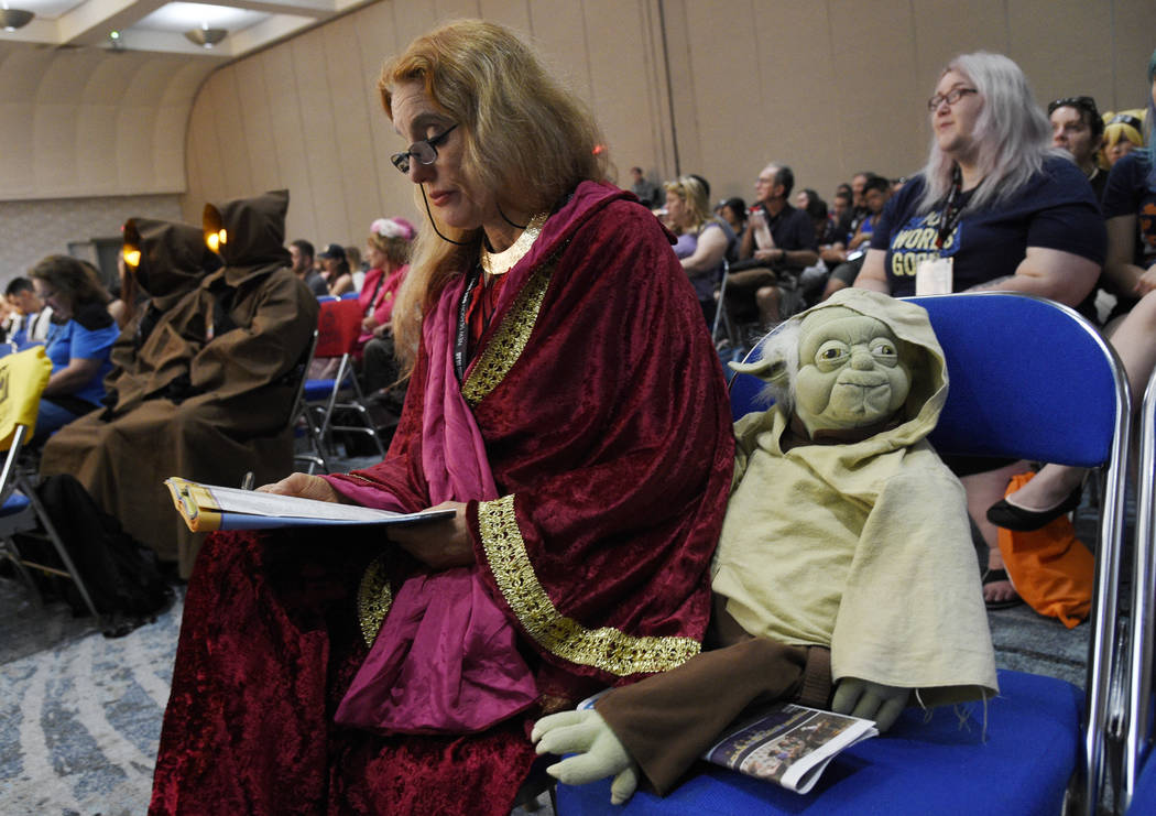 A Yoda doll based on the character from the "Star Wars" movie franchise sits next to fan Patricia Law Games of San Diego, Calif., as she listens to guest speakers at the Princess Leia Star Wars Fan Club Tribute Presentation during the 2017 Comic-Con International on Sunday, July 23, 2017, in San Diego, Calif. (Photo by Chris Pizzello/Invision/AP)