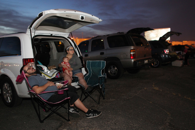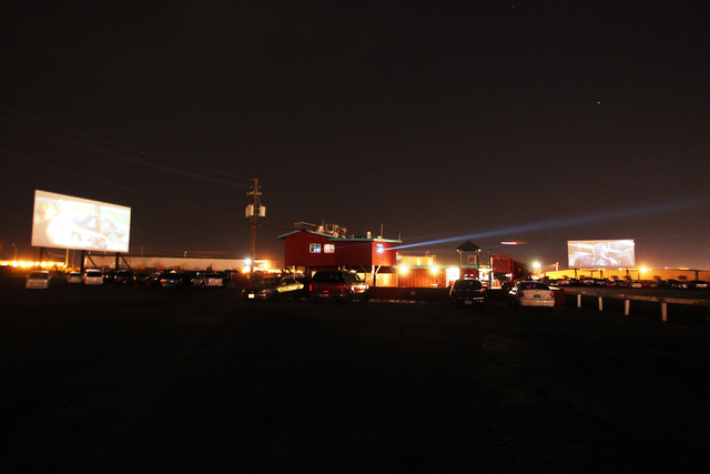 Relinquishing the last of its orange glow, the sun dips below the mountains in the background, while the digital projectors gear up in preparation for another night at the West Wind Las Vegas Drive-In.
