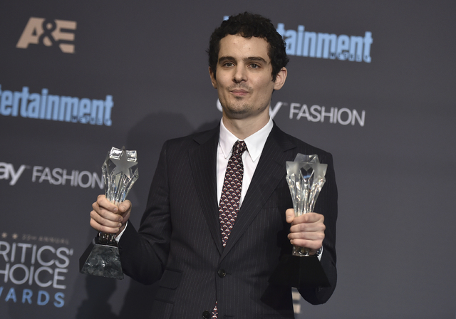 Damien Chazelle poses in the press room with the awards for best picture and best director for “La La Land” at the 22nd annual Critics’ Choice Awards at the Barker Hangar on Sunday, Dec. 11, 2016, in Santa Monica, Calif. (Jordan Strauss/Invision/AP)