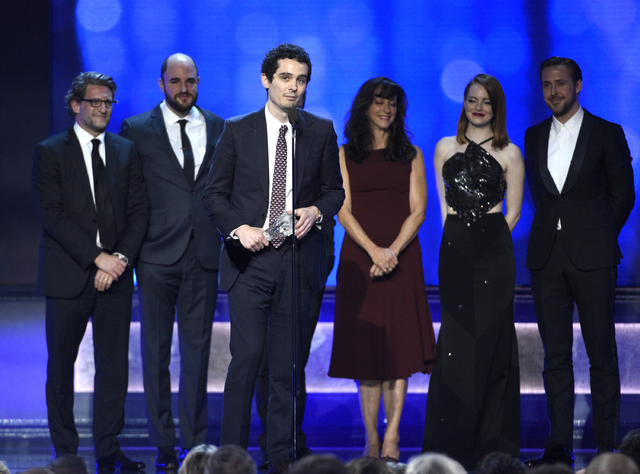 Director Damien Chazelle, center, accepts the award for best picture for “La La Land” at the 22nd annual Critics’ Choice Awards at the Barker Hangar on Sunday, Dec. 11, 2016, in Santa Monica, Calif. Pictured on stage from left, Gary Gilbert, Jordan Horowitz, Mary Zophres, Emma Stone, and Ryan Gosling. (Chris Pizzello/Invision/AP)