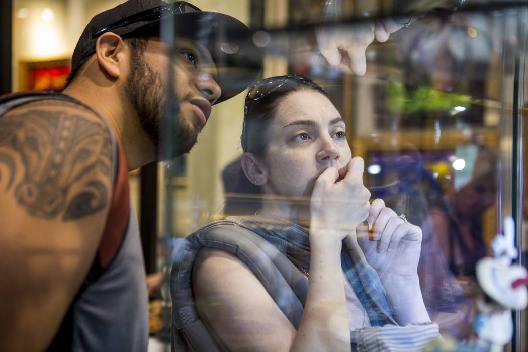 Tashua, right, and Angel Jaramillo browse art with her one-month-old son Ronin in a chest carrier during the grand opening of the Magical Memories Disney Fine Art Gallery in the Forum Shops at Caesars on Thursday, Aug. 10, 2017. Patrick Connolly Las Vegas Review-Journal @PConnPie