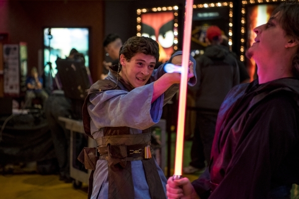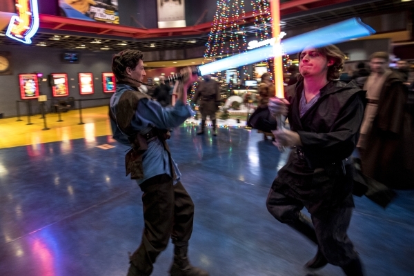 Carlos Godinez, left, and Evan Deiro battle with light sabers during opening night of "Star Wars: The Force Awakens" at the Galaxy Theaters at the Cannery hotel-casino in Las Vegas on Thursday, Dec. 17, 2015. Joshua Dahl/Las Vegas Review-Journal