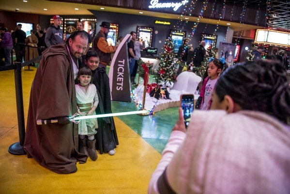 Carlos Godinez, left, poses for a photo with Giulianna Levinne, 4, and Joshua Diaz, 7, during opening night of "Star Wars: The Force Awakens" at the Galaxy Theaters at the Cannery hotel-casino in Las Vegas on Thursday, Dec. 17, 2015. Joshua Dahl/Las Vegas Review-Journal