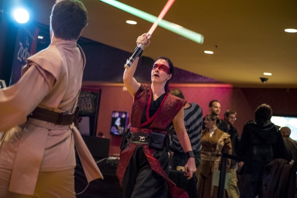 Aryn Ross, left, and Evan Deiro battle with light sabers during opening night of "Star Wars: The Force Awakens" at the Galaxy Theaters at the Cannery hotel-casino in Las Vegas on Thursday, Dec. 17, 2015. Joshua Dahl/Las Vegas Review-Journal