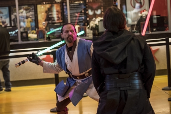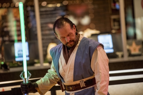 Carlos Godinez holds a light saber during opening night of "Star Wars: The Force Awakens" at the Galaxy Theaters at the Cannery hotel-casino in Las Vegas on Thursday, Dec. 17, 2015. Joshua Dahl/Las Vegas Review-Journal