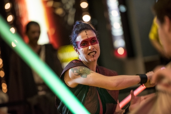 Members of the Saber Guild entertained moviegoers at Galaxy Theaters at the Cannery hotel-casino on the opening night of “Star Wars: The Force Awakens.”