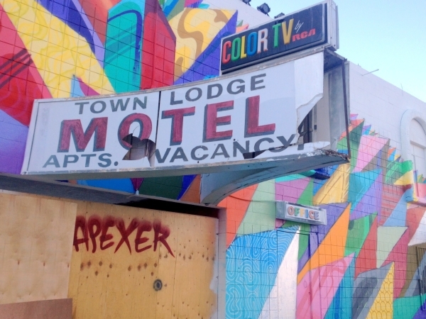 Before Bear takes us over to the Troubadour Stage, which is actually within walking distance of where we meet him on the corner of 7th and Fremont, he graciously wheels us around the festival grounds on a golf cart, giving us a sneak peek of this year's offerings. First we make a stop at the Main Stage, then we pop by the Art Motel, where a collection of artists are busily making last-minute adjustments to their installations, and then we stop briefly by the Boombox artcar, before proceeding to our final destination.