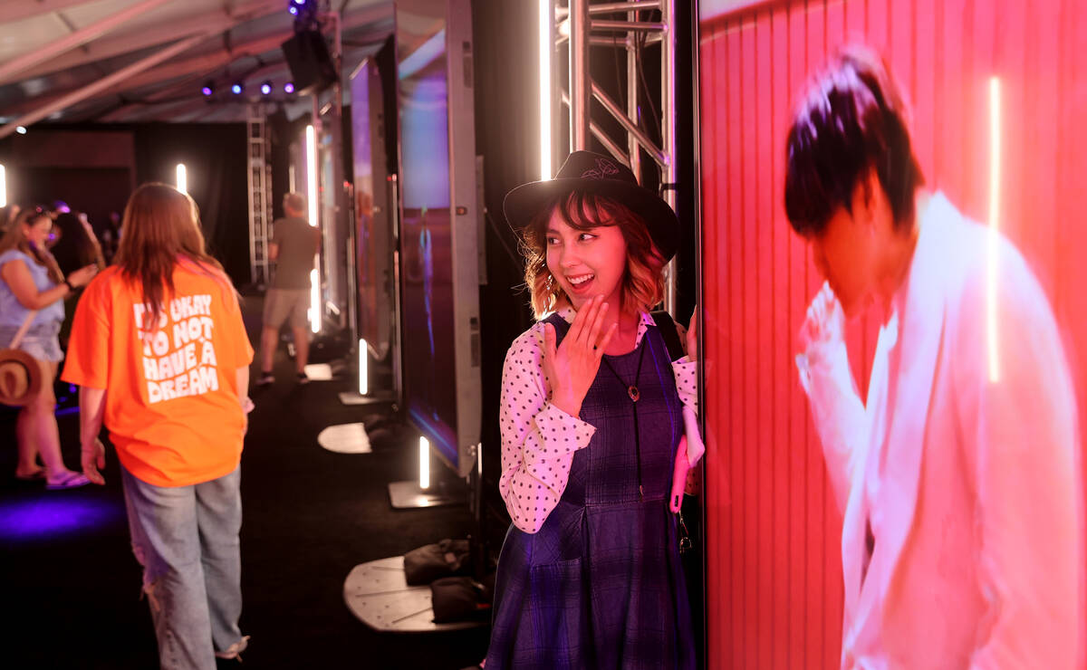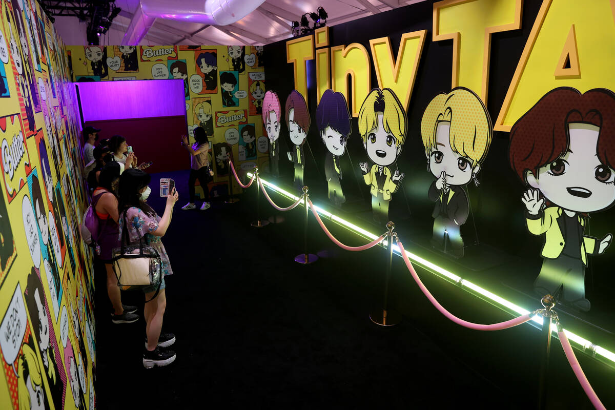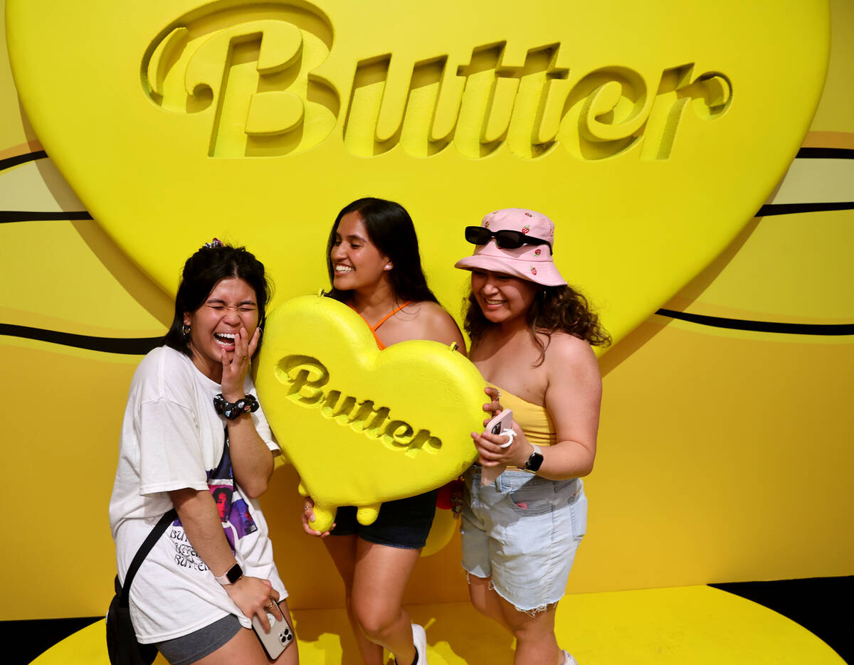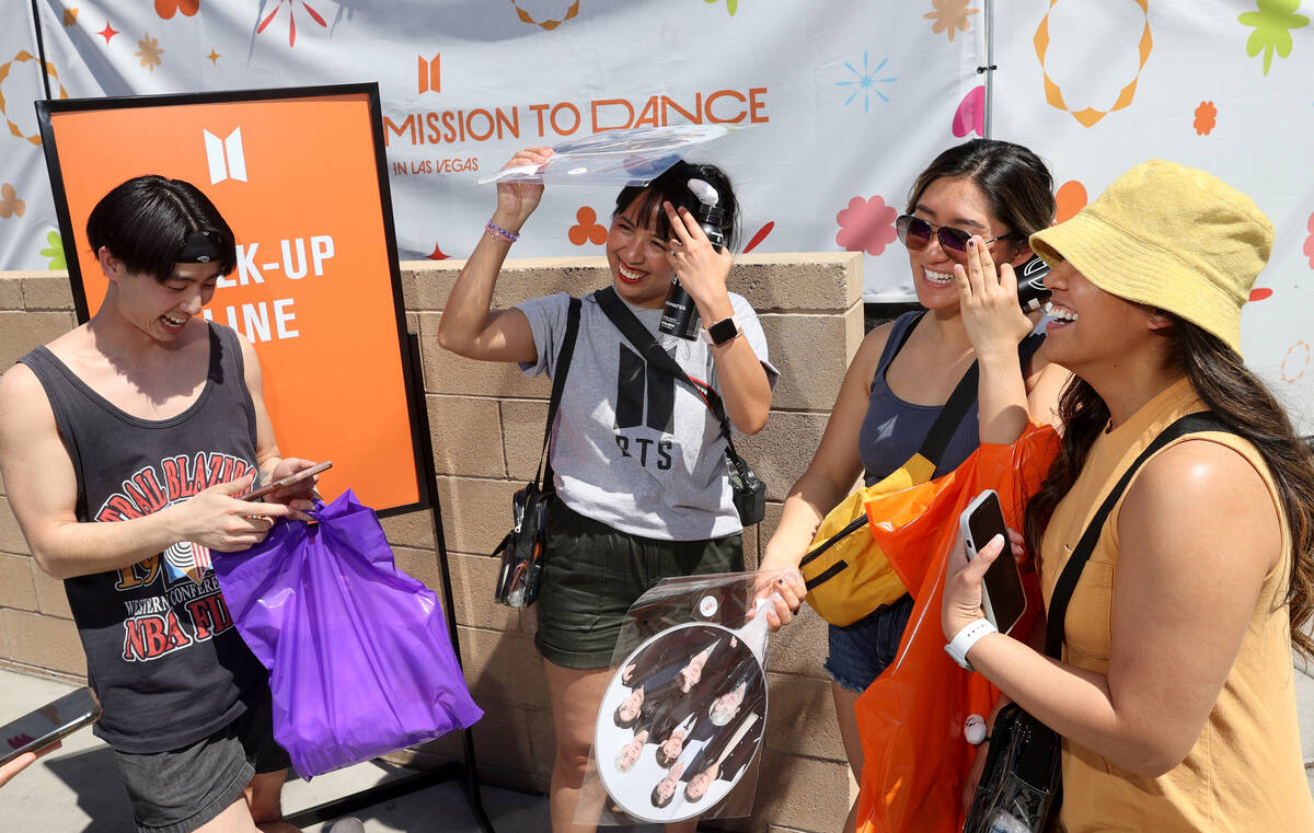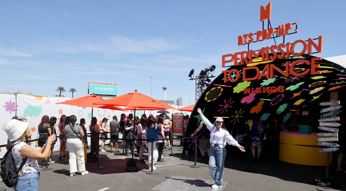 Now in Vegas, fans are excited to be exploring the city’s makeover for them. Some restaurants promote specialty items, marquees along the Strip have turned purple, a favorite color of BTS, and a pop-up event near Area 15 takes fans through set pieces modeled after BTS music videos. Outside Allegiant Stadium, fans queued up to buy T-shirts and other BTS merchandise.