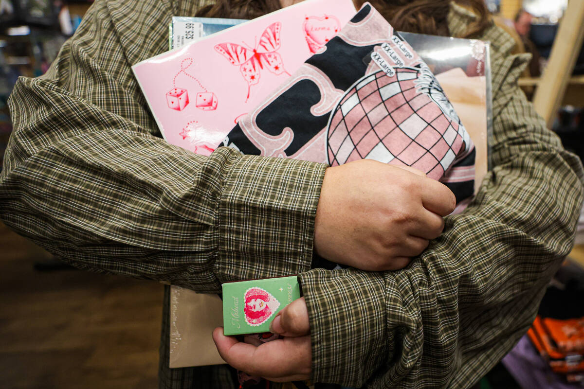 A Chappell roan fan holds a box of matches and other Chappell Roan merchandise during a listening party in honor of the one year anniversary of Chappell Roan’s “The Rise and Fall of a Midwest Princess” album at Zia Records on Sunday, Sept. 22, 2024, in Las Vegas. (Madeline Carter/Las Vegas Review-Journal)