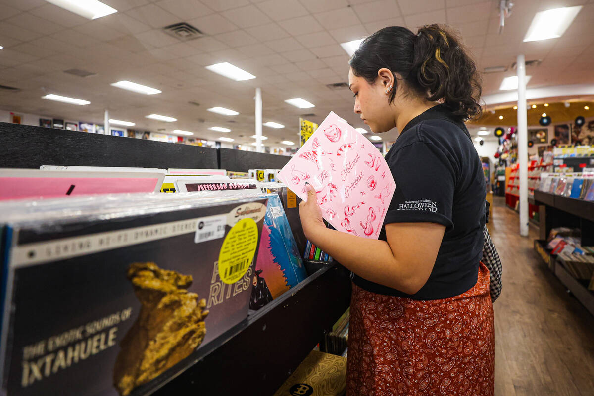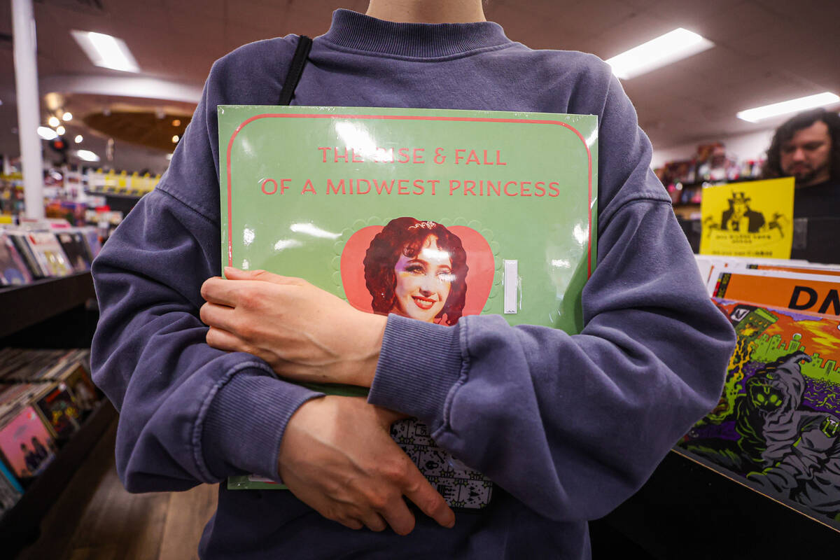 A Chappell Roan fan sorts through vinyls while holding Chappell Roan themed stickers during a listening party in honor of the one year anniversary of Chappell Roan’s “The Rise and Fall of a Midwest Princess” album at Zia Records on Sunday, Sept. 22, 2024, in Las Vegas. (Madeline Carter/Las Vegas Review-Journal)