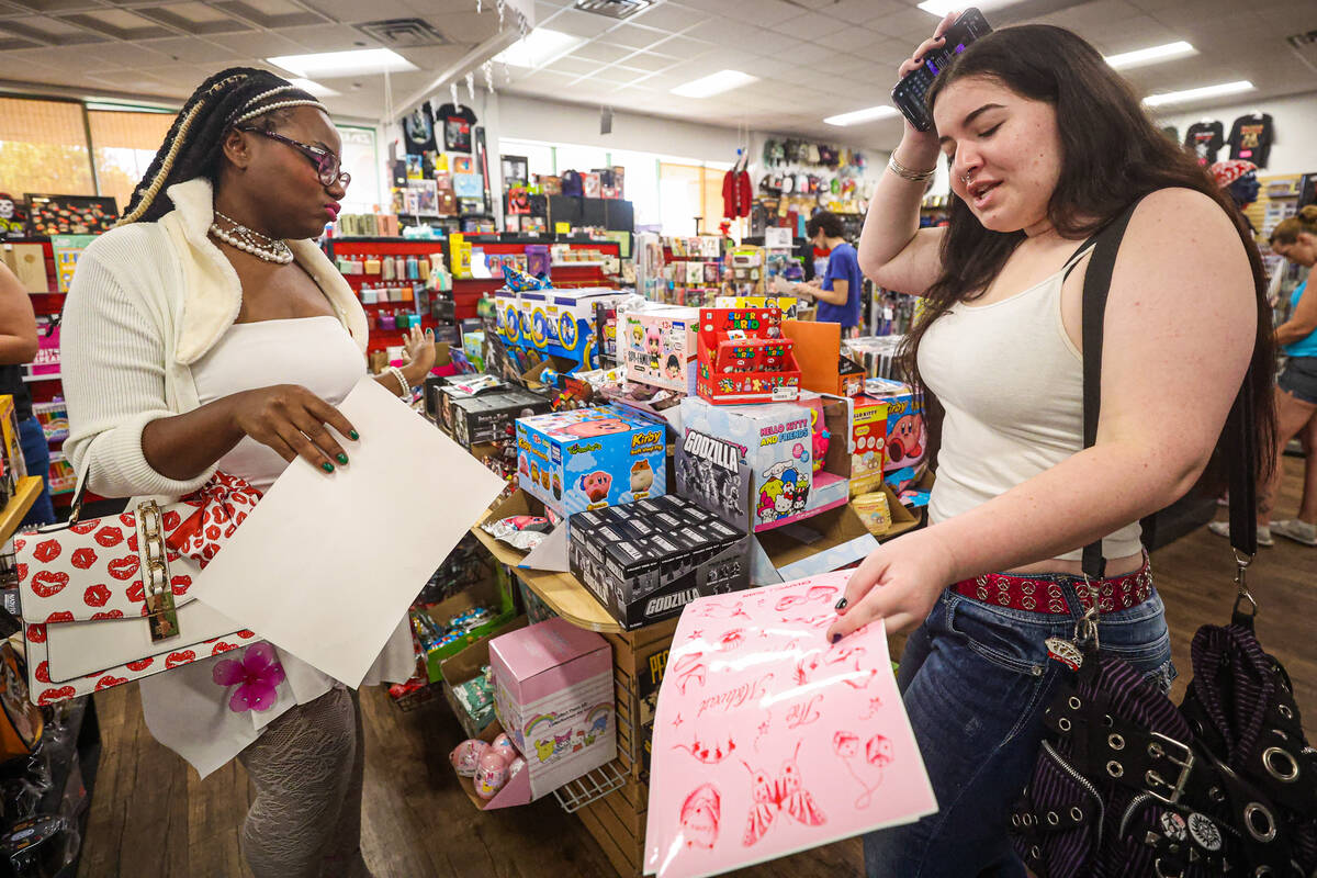 Karina Vega, left, takes a photograph of Darrah Westbay, right, during a listening party in honor of the one year anniversary of Chappell Roan’s “The Rise and Fall of a Midwest Princess” album at Zia Records on Sunday, Sept. 22, 2024, in Las Vegas. (Madeline Carter/Las Vegas Review-Journal)