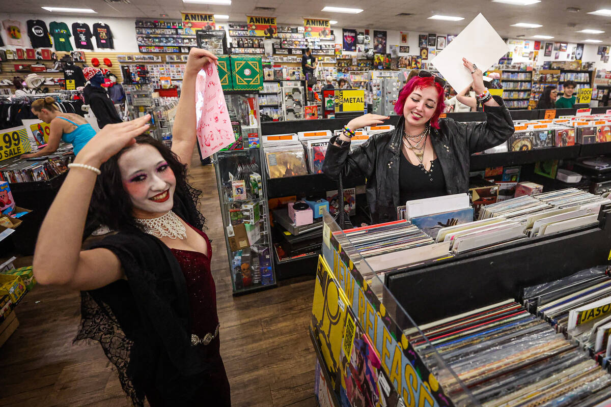 Chappell Roan fans Megumi Biggs, left, and Layne Lieber dance to “Hot To Go!” during a listening party in honor of the one year anniversary of Chappell Roan’s “The Rise and Fall of a Midwest Princess” album at Zia Records on Sunday, Sept. 22, 2024, in Las Vegas. (Madeline Carter/Las Vegas Review-Journal)