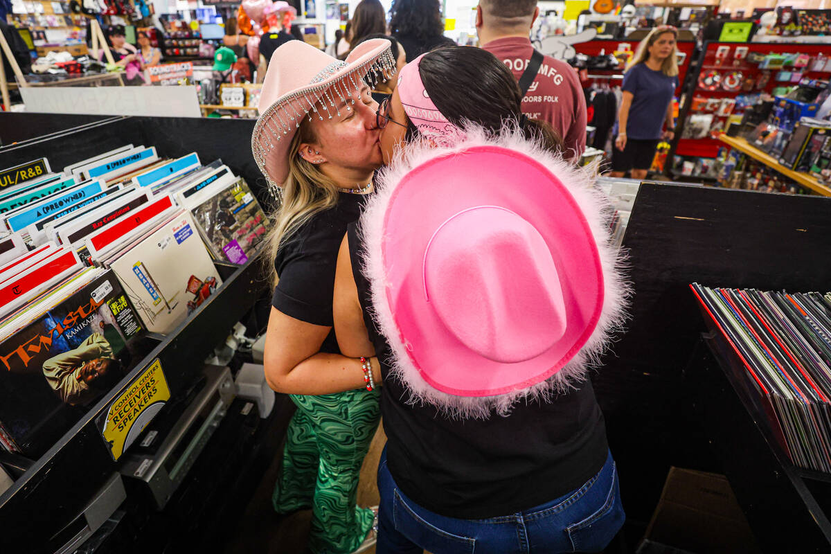 Darrah Westbay, left, kisses Karina Vega, during a listening party in honor of the one year anniversary of Chappell Roan’s “The Rise and Fall of a Midwest Princess” album at Zia Records on Sunday, Sept. 22, 2024, in Las Vegas. (Madeline Carter/Las Vegas Review-Journal)