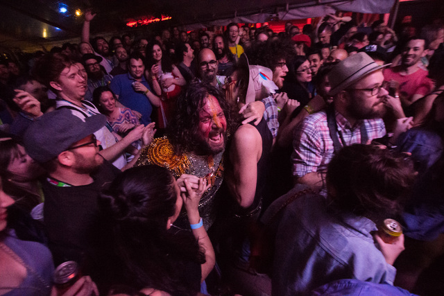 Zapot Mgwana, center, of Golden Dawn Arkestra gets in the crowd while performing at Maggie Mae's during the first night of the SXSW music festival in downtown Austin, Texas on Tuesday, March 15, 2016. Chase Stevens/Las Vegas Review-Journal Follow @csstevensphoto