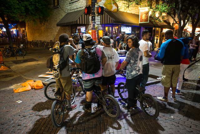 People on bikes crowd together during the first night of the SXSW music festival in downtown Austin, Texas on Tuesday, March 15, 2016. Chase Stevens/Las Vegas Review-Journal Follow @csstevensphoto