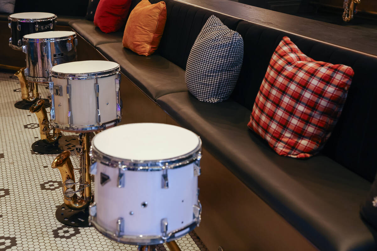 The 3,500-square-foot venue occupies the space that formerly housed New Orleans-themed bar Bourbon St. Parade, and some of its flourishes remain: drumhead table tops mounted atop brass instruments; a sizable, red-hued stage, a rainbow-colored upright piano.
