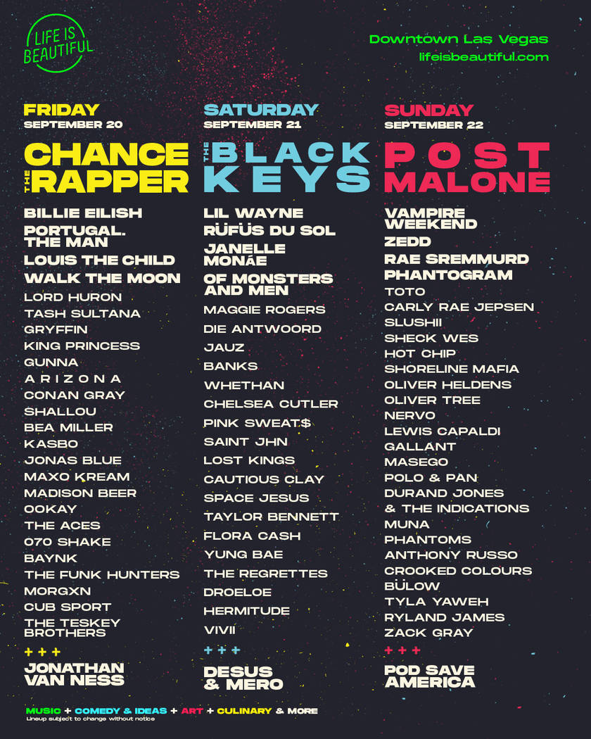 Daily lineups have been revealed for this year’s Life is Beautiful, with the aforementioned hip-hopper, Post Malone, headlining the downtown music and arts festival Sept. 22.