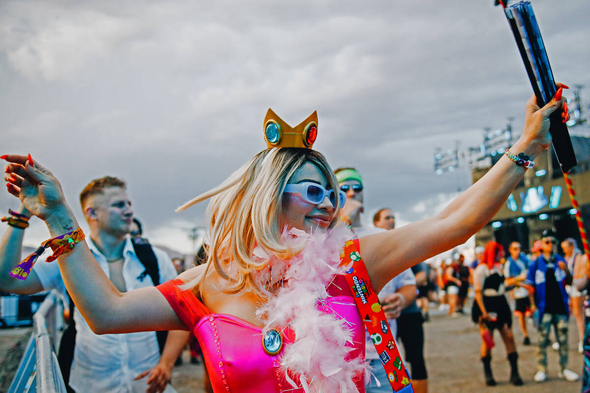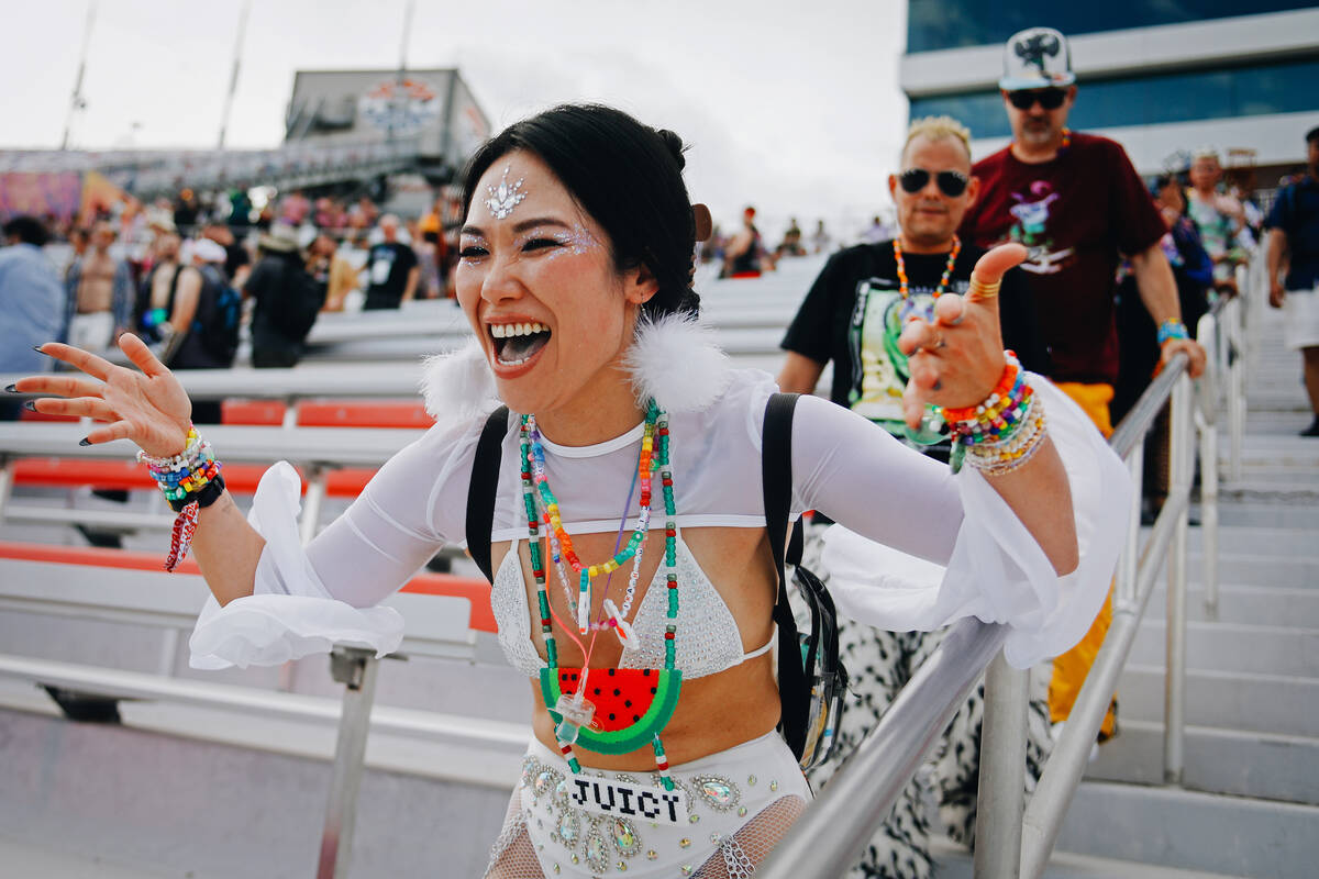 A festival goer dances her way into festival grounds during the first day of Electric Daisy Carnival at Las Vegas Motor Speedway on Friday, May 19, 2023, in Las Vegas. (Madeline Carter/Las Vegas Review-Journal)