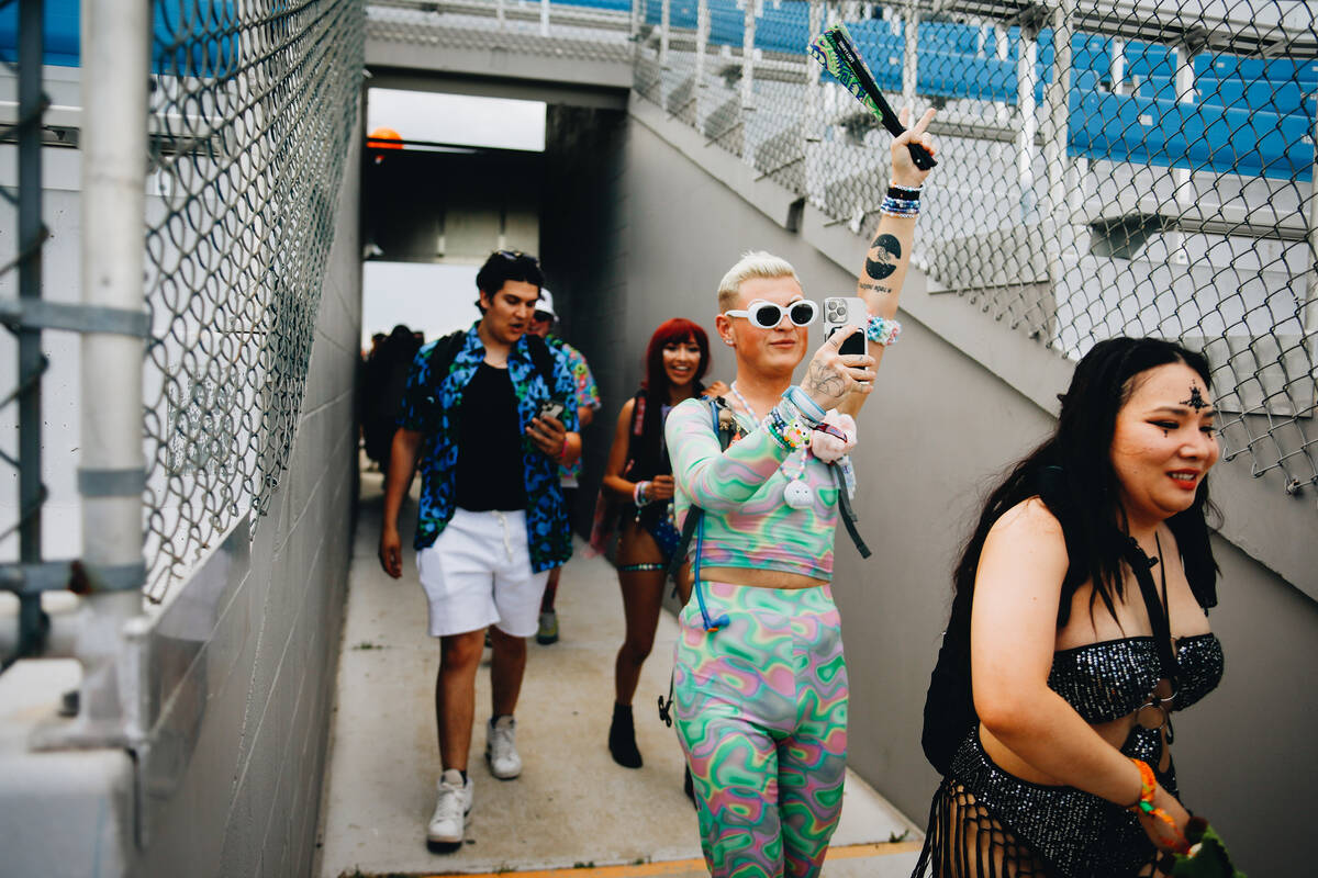 Festival attendees take selfies and walk throughout the festival grounds during the first day of Electric Daisy Carnival at Las Vegas Motor Speedway on Friday, May 19, 2023, in Las Vegas. (Madeline Carter/Las Vegas Review-Journal)