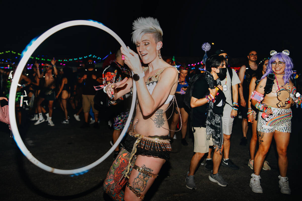 Billie Peterson, left, dances with a hula hoop during the first day of Electric Daisy Carnival at Las Vegas Motor Speedway on Friday, May 19, 2023, in Las Vegas. (Madeline Carter/Las Vegas Review-Journal)