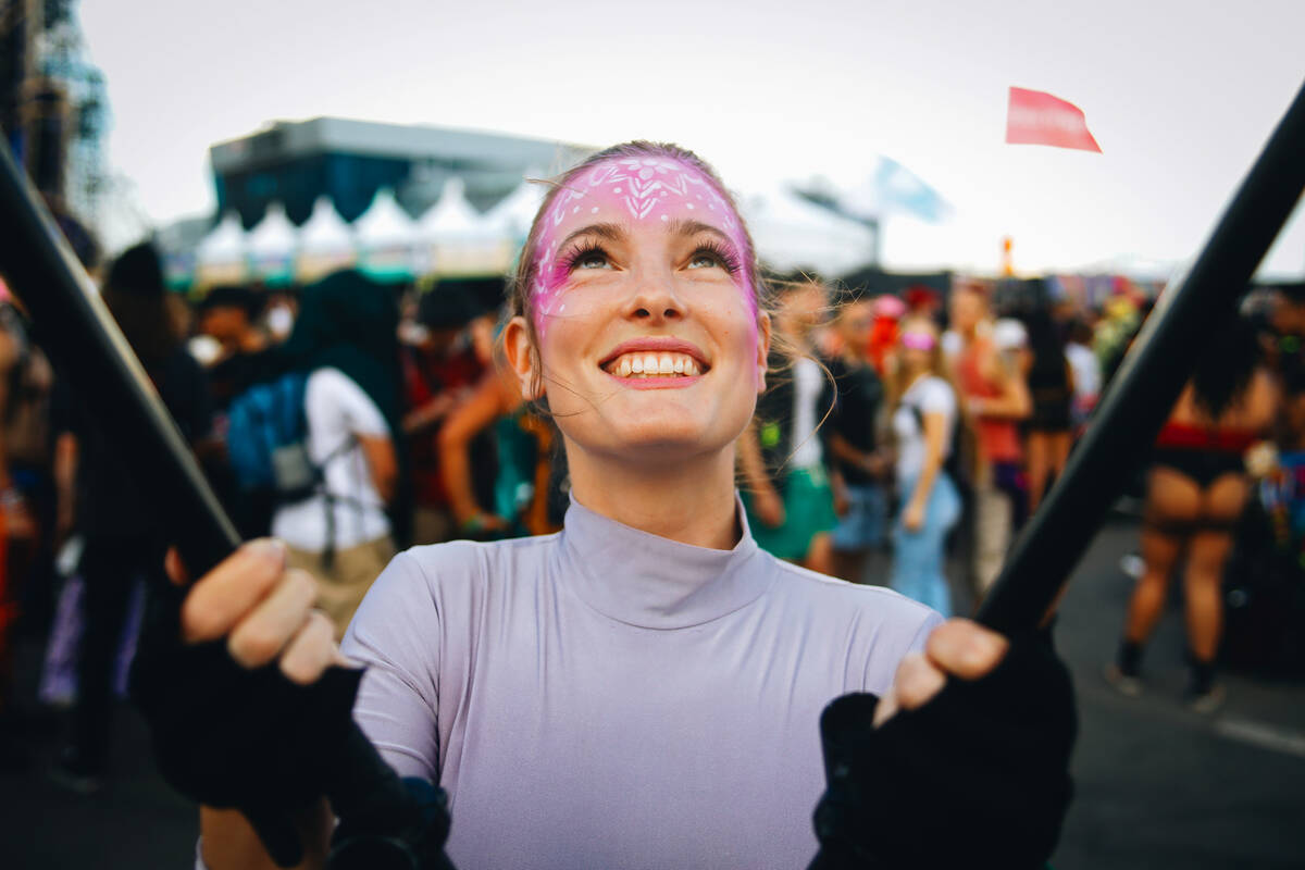 Valerie Bartolome laughs with her friends (out of frame) during the first day of Electric Daisy Carnival at Las Vegas Motor Speedway on Friday, May 19, 2023, in Las Vegas. (Madeline Carter/Las Vegas Review-Journal)