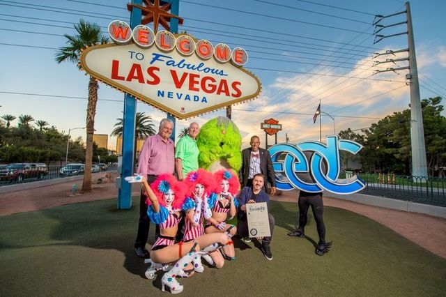 Anyhow, listen, since we’re flapping our gums here, he’s the dude in front, obviously, holding up the plaque. The Clark County Commissioners — represented at the ceremony by Steve Sisolak, Lawrence Weekly and Larry Brown — evidently declared this week “EDC Week” in honor of, well, EDC, this edition of the festival, more specifically, which marks the event’s fifth year in Las Vegas.