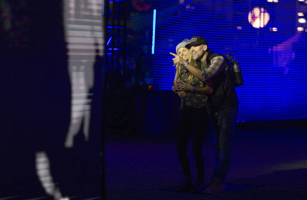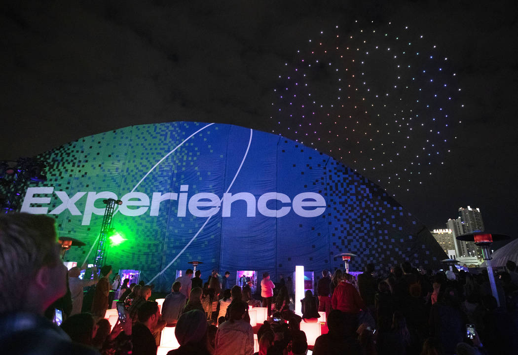 But for now, it was a recording of the tune that played at the Las Vegas Festival Grounds on Friday as the drones floated into view, first amassed together, like a flock of luminescent geese, then spinning off into a variety of patterns — a jellyfish, stars, the female form — before culminating in a giant, rainbow-hued smiley face.
