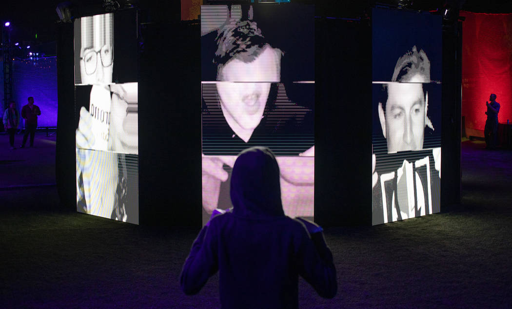Nearby was Spanish studio Tigrelab’s interactive “Mixed Mirrors,” where attendees could stand in place in front of a cylindrical video wall and have their picture taken, which then would be incorporated into a black-and-white pastiche of body parts.