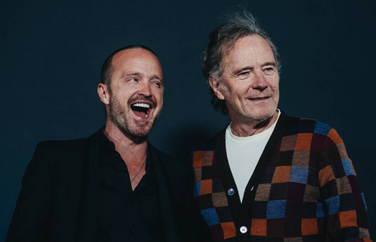 Actors Aaron Paul, left, and Bryan Cranston pose for photographs outside of the Sphere during its opening night on Friday, Sept. 29, 2023, in Las Vegas. (Madeline Carter/Las Vegas Review-Journal)