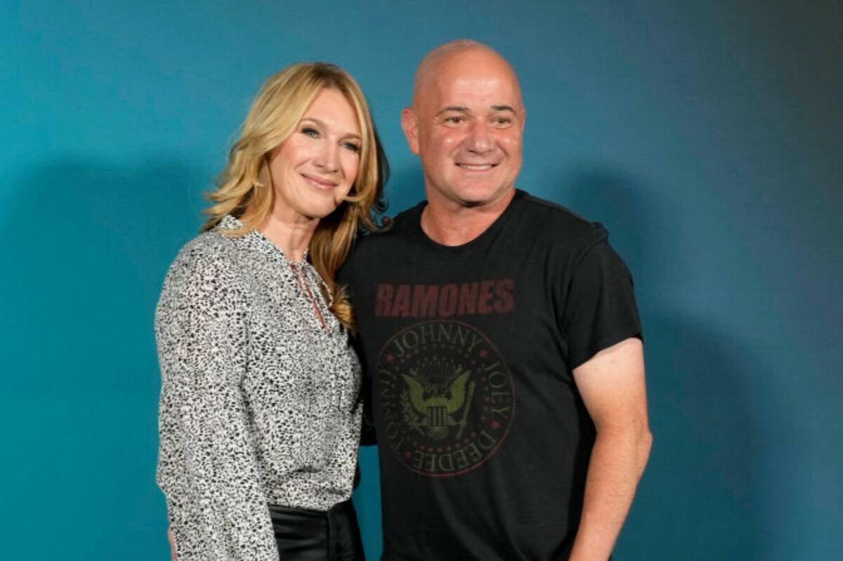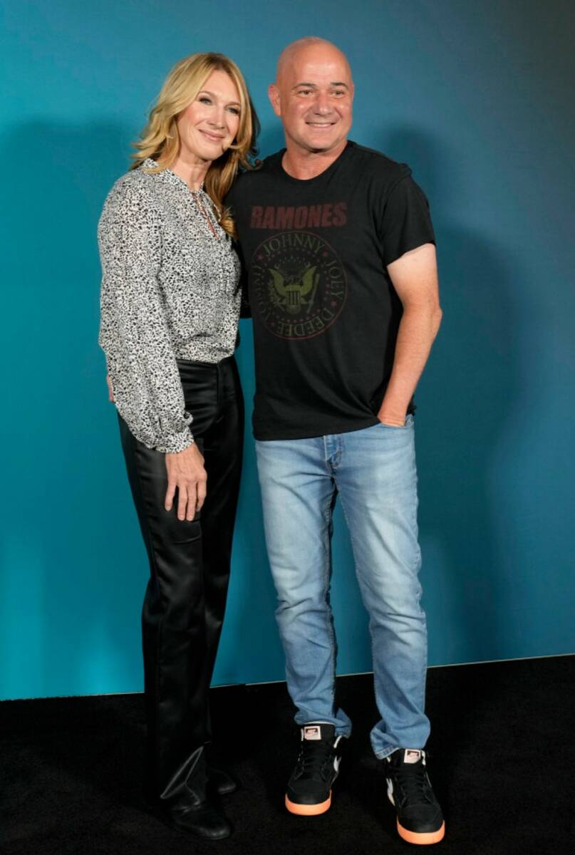 Former tennis stars Steffi Graf, left, and Andre Agassi pose during the opening night of the Sphere, Friday, Sept. 29, 2023, in Las Vegas. (AP Photo/John Locher)