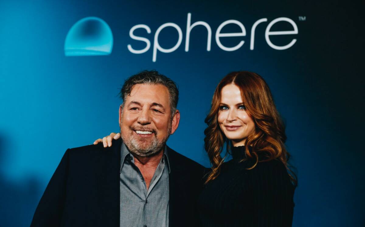 Jim Dolan, executive chairman and CEO of Sphere Entertainment, left, poses for a photograph with his girlfriend, Kathryn Rotella, outside of the Sphere during its opening night on Friday, Sept. 29, 2023, in Las Vegas. (Madeline Carter/Las Vegas Review-Journal)