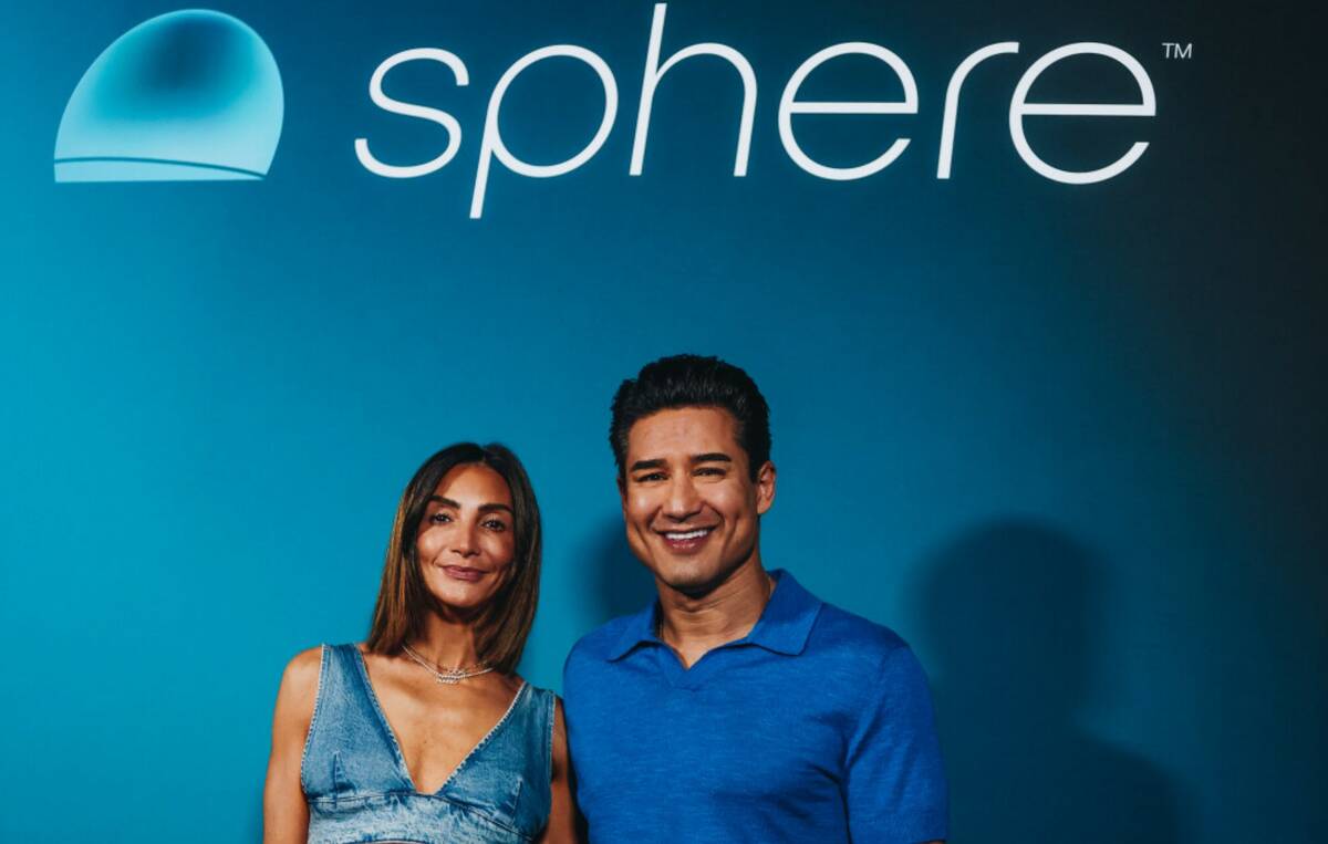 Mario Lopez, right, poses with his wife, Courtney Mazza, outside of the Sphere during its opening night on Friday, Sept. 29, 2023, in Las Vegas. (Madeline Carter/Las Vegas Review-Journal)
