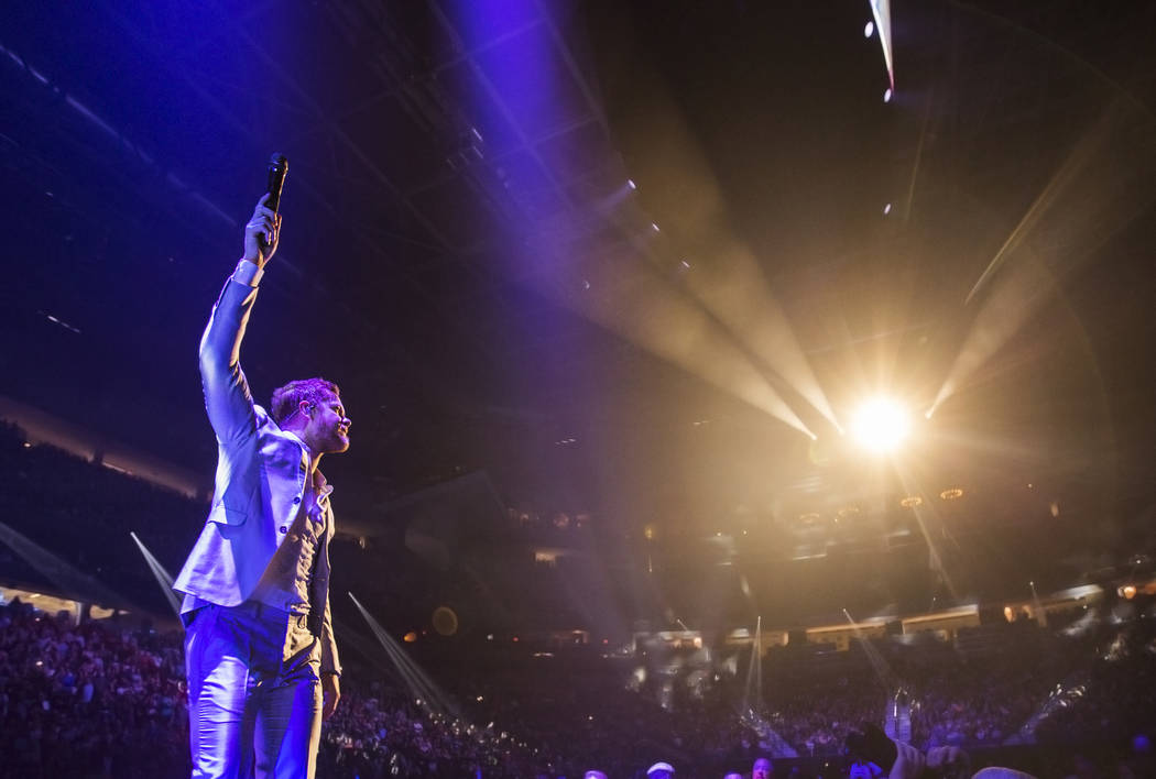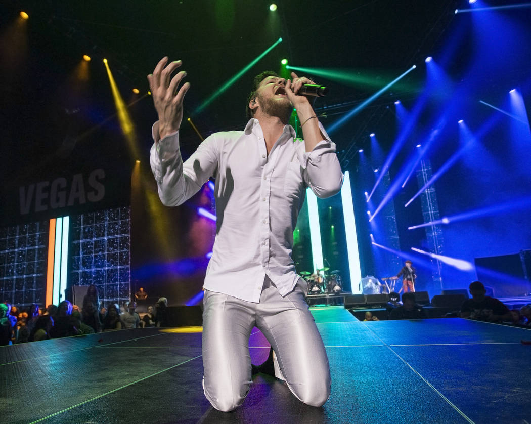 “If you can hold on, hold on,” Flowers instructed during “All These Things I’ve Done,” which came shortly before the band invited all the acts on the bill to join them on stage for a show-closing “Viva Las Vegas,” Flowers trading lines with Reynolds, Carrot Top getting down next to Wayne Newton, who had introduced a pre-taped performance by Elton John earlier.