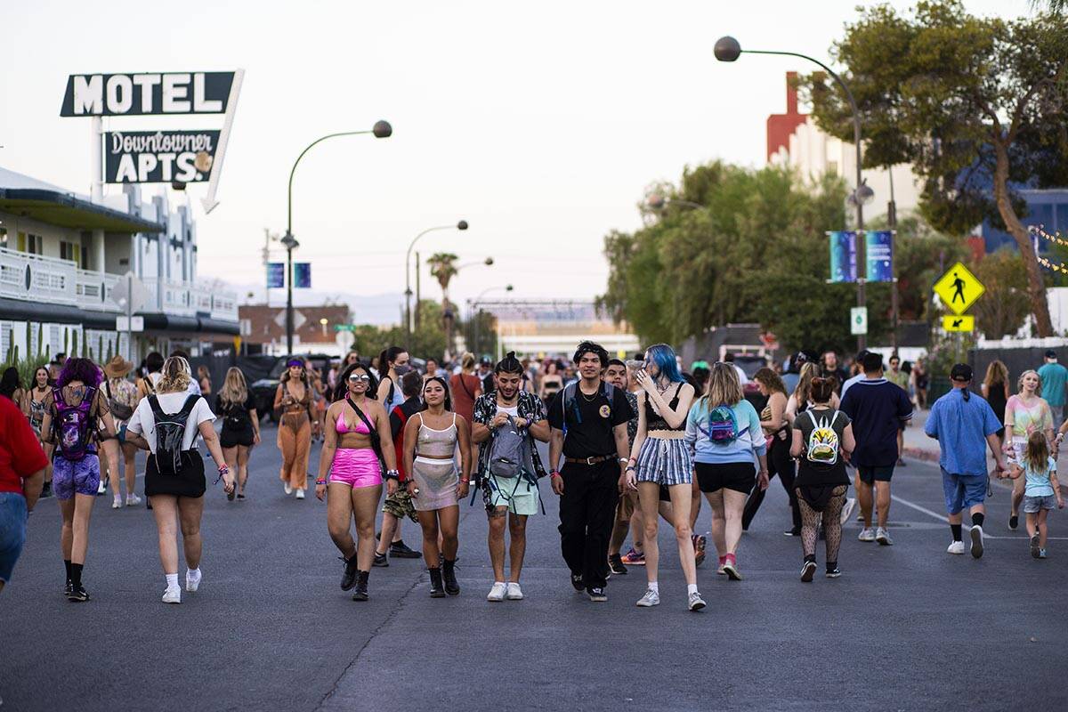 Attendees walk the festival grounds during the final day of the Life is Beautiful festival in downtown Las Vegas on Sunday, Sept. 19, 2021. (Chase Stevens/Las Vegas Review-Journal) @csstevensphoto