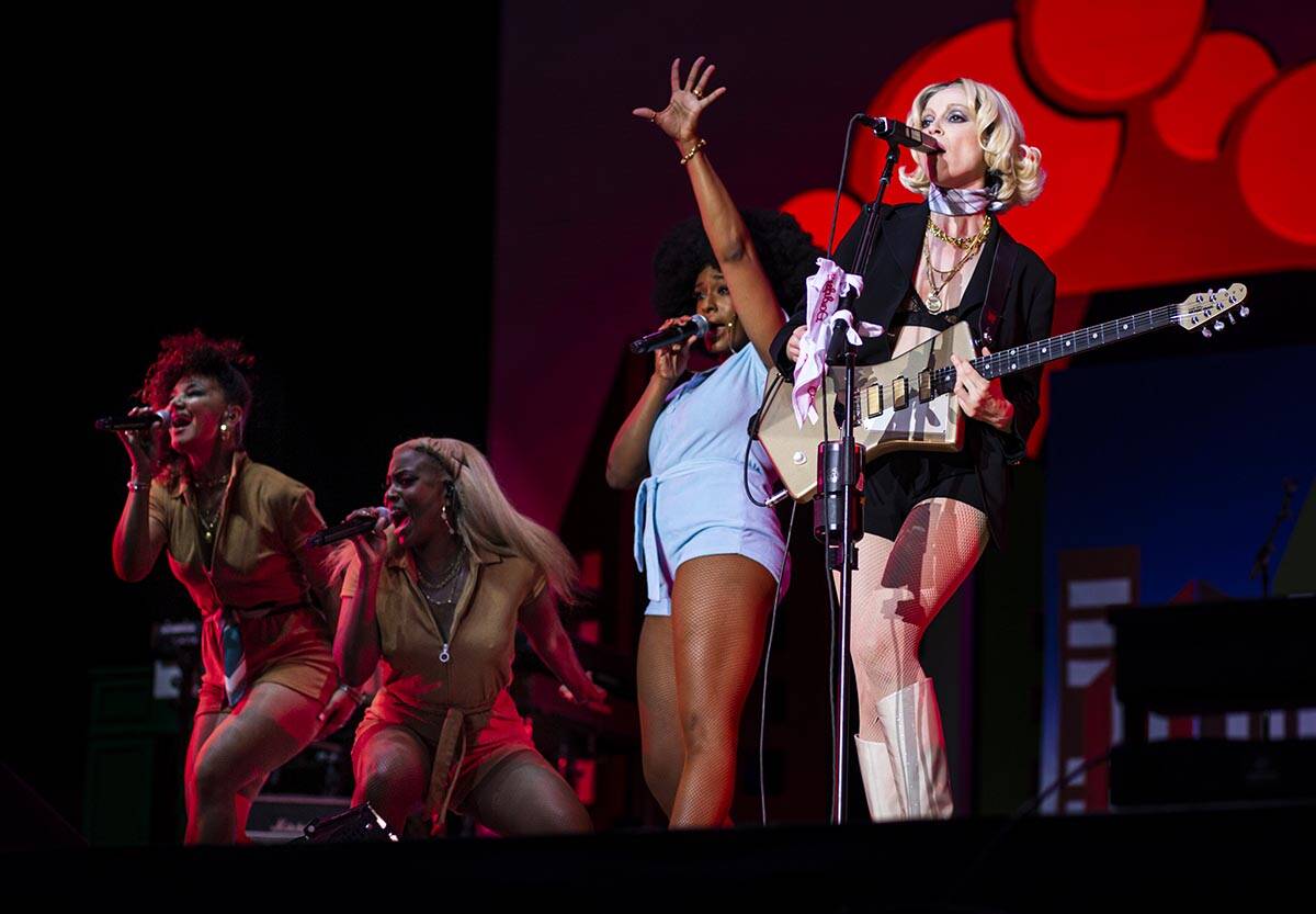 St. Vincent, left, performs with her band at the downtown stage during the final day of the Life is Beautiful festival in downtown Las Vegas on Sunday, Sept. 19, 2021. (Chase Stevens/Las Vegas Review-Journal) @csstevensphoto