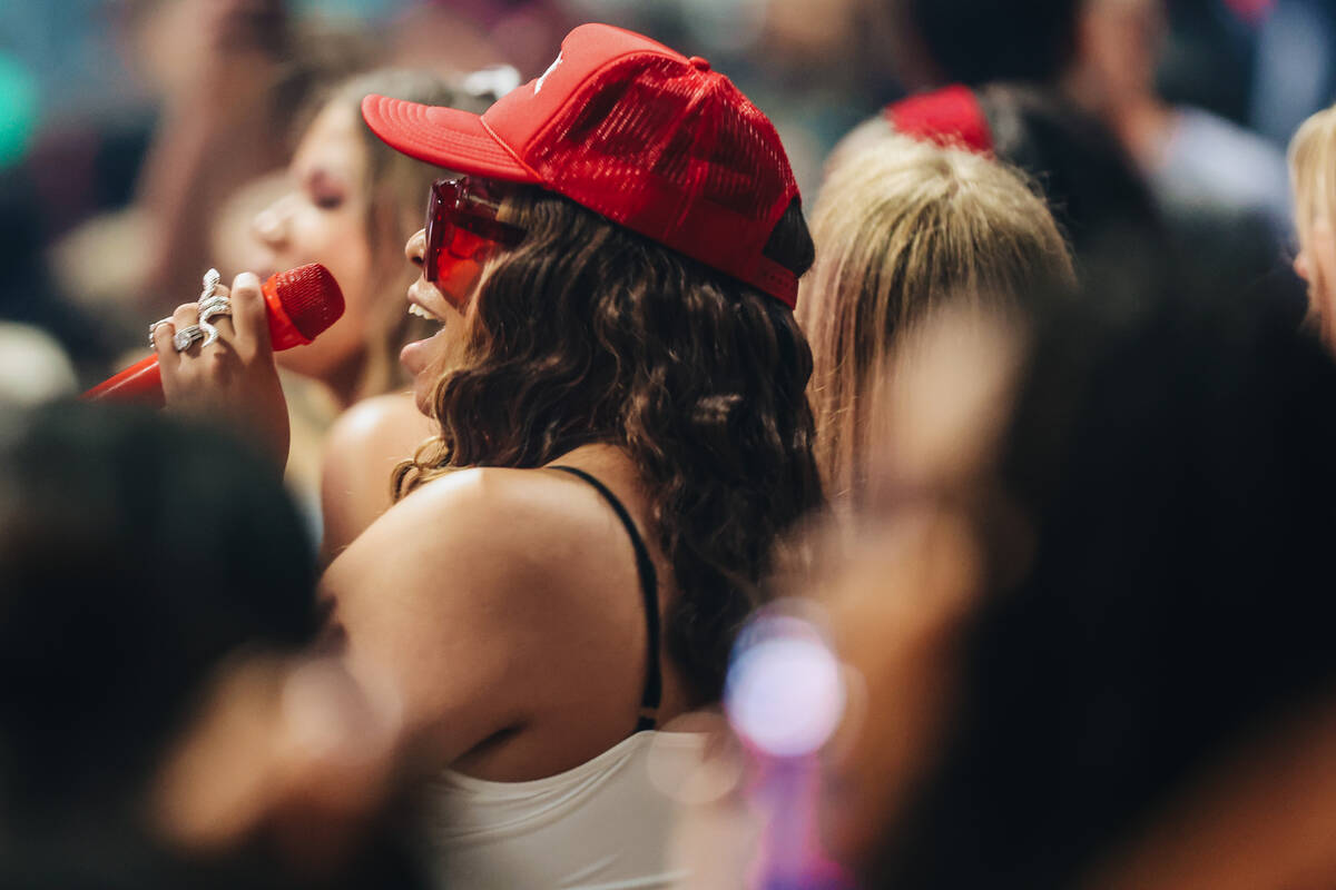 A fan sings into a microphone that she brought with her during the Hot girl Summer Tour at MGM Grand Garden Arena on Saturday, June 22, 2024, in Las Vegas. (Madeline Carter/Las Vegas Review-Journal)