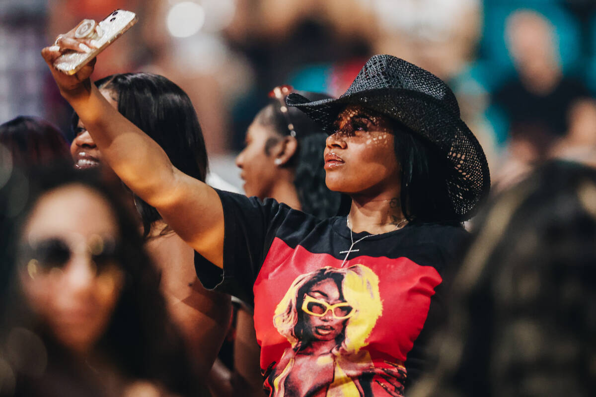 A fan takes a selfie before Megan Thee Stallion takes the stage during the Hot girl Summer Tour at MGM Grand Garden Arena on Saturday, June 22, 2024, in Las Vegas. (Madeline Carter/Las Vegas Review-Journal)