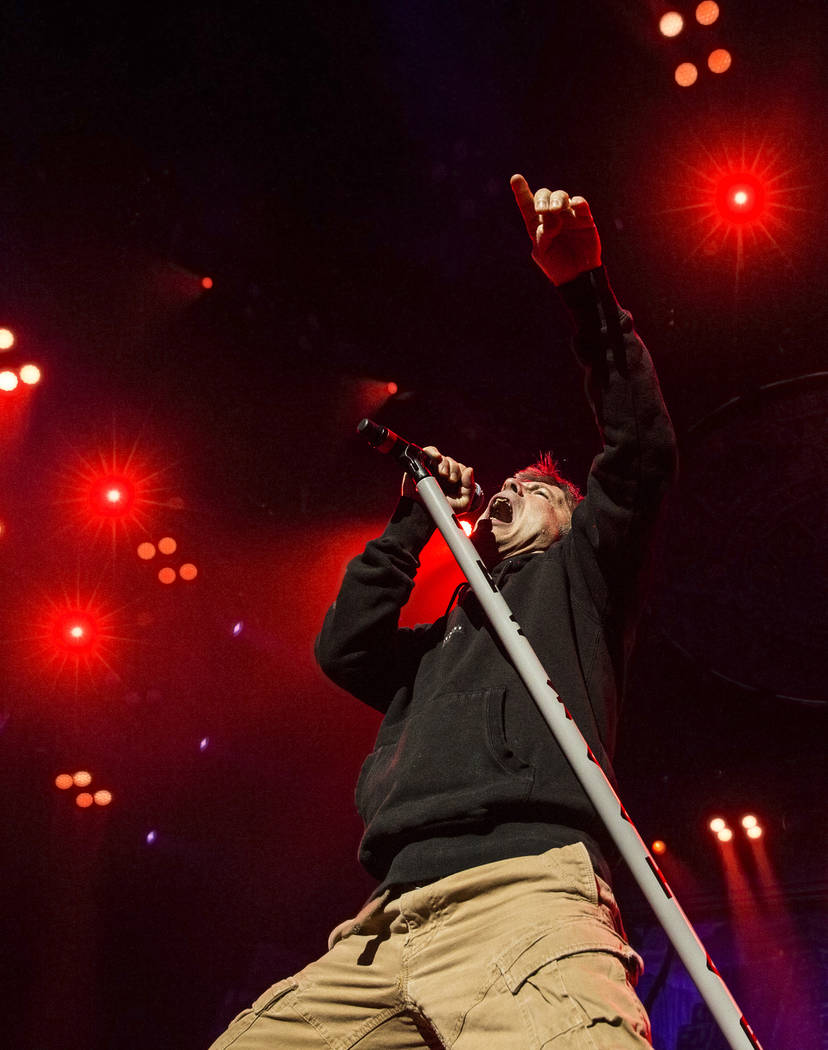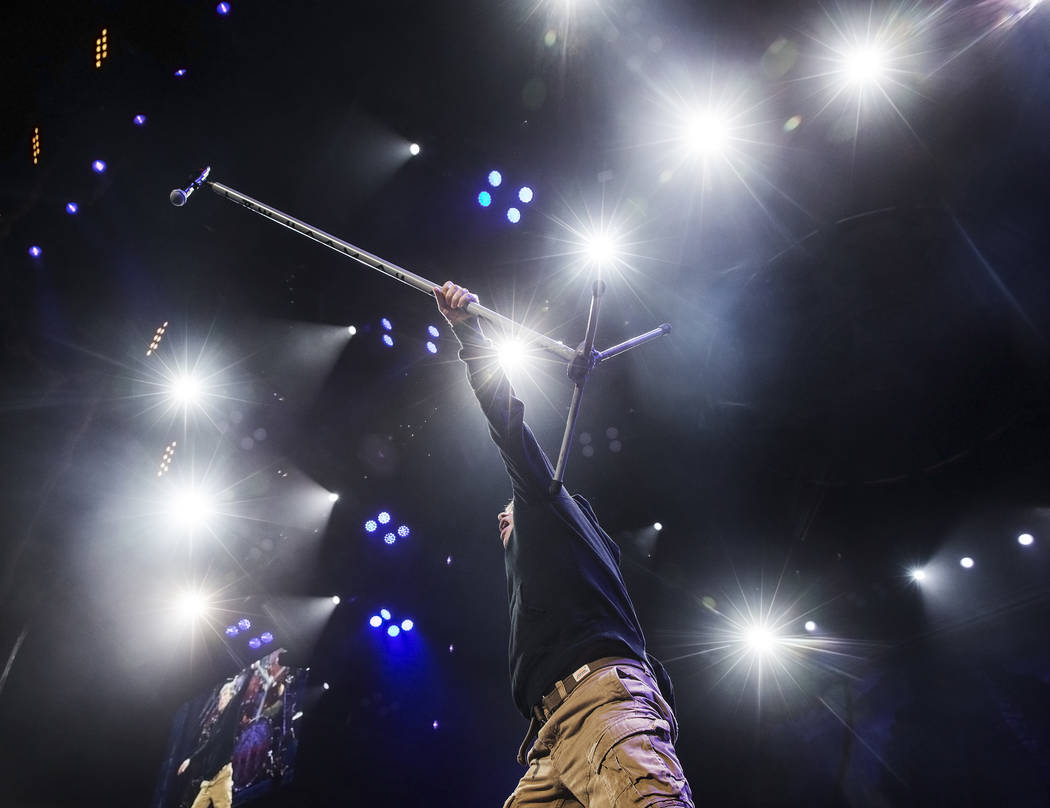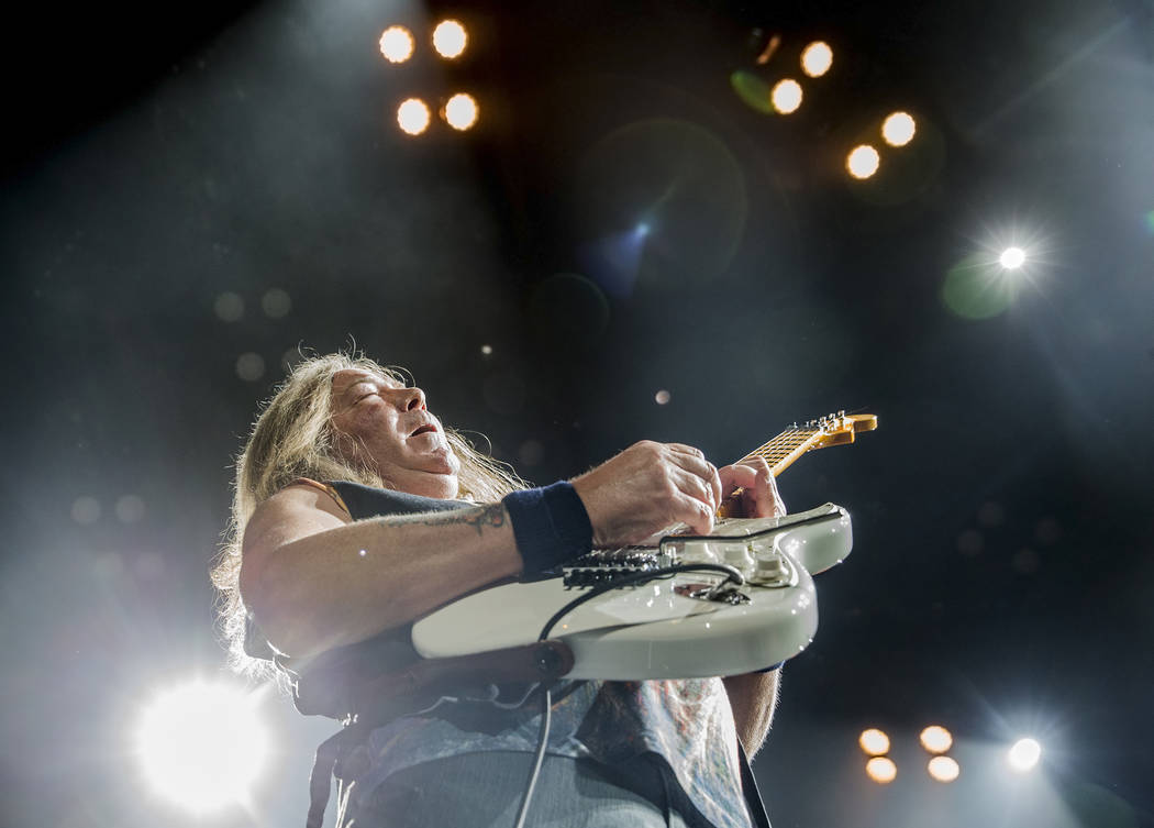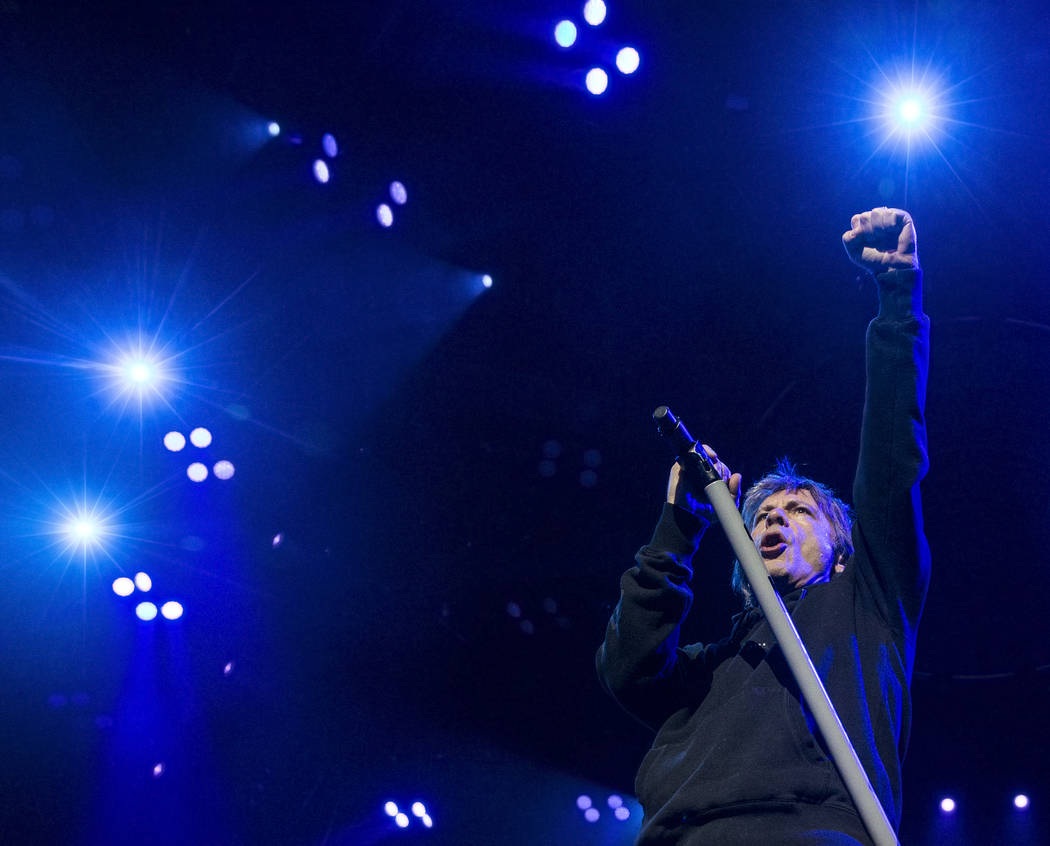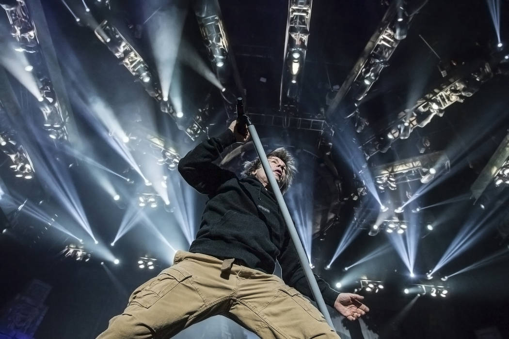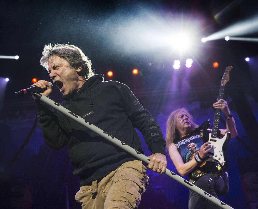 Dickinson’s hair is shorter these days and he’s relegated his leather-heavy stage get-ups of old to the S&M consignment shop, but other than that, little has changed — at least in terms of performance — for heavy metal’s definitive frontman, a real-life airline pilot who bounds about the stage with the limber physique and irrepressible energy levels of an over-caffeinated Pilates instructor.