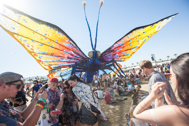 Attendees crowd around for a photo with art piece Papilio Merraculous, created by art group Poetic Kinetics, during the second weekend of Coachella Valley Music & Arts Festival at the Empire Polo Club on Saturday, April 18, 2015 in Indio, Calif. (Chase Stevens/Las Vegas Review-Journal) Follow Chase Stevens on Twitter at @csstevensphoto