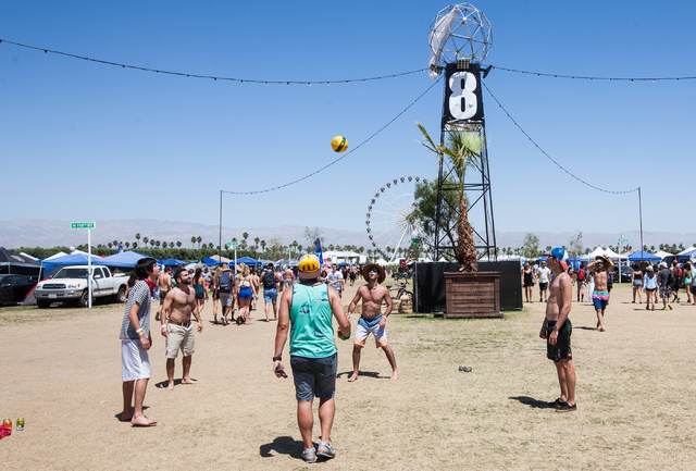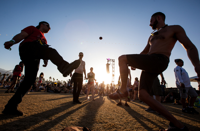Attendees play with a hacky sack during the second weekend of Coachella Valley Music & Arts Festival at the Empire Polo Club on Saturday, April 18, 2015 in Indio, Calif. (Chase Stevens/Las Vegas Review-Journal) Follow Chase Stevens on Twitter at @csstevensphoto