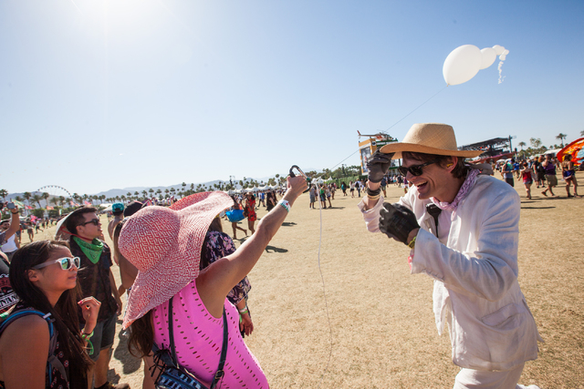 Jill Woodward holds the end of the balloon chain, created by Robert Bose, as Andrew (last name declined), right, looks on during the second weekend of Coachella Valley Music & Arts Festival at the Empire Polo Club on Saturday, April 18, 2015 in Indio, Calif. (Chase Stevens/Las Vegas Review-Journal) Follow Chase Stevens on Twitter at @csstevensphoto